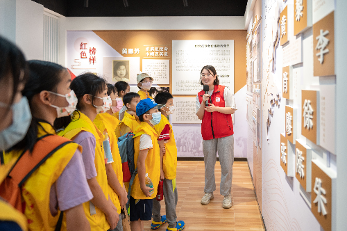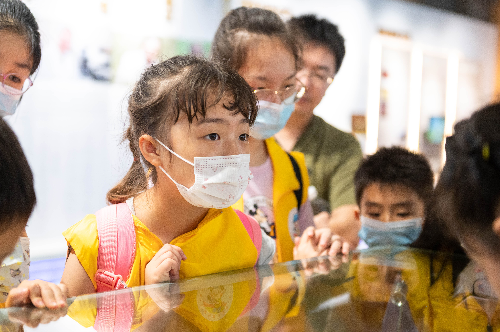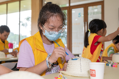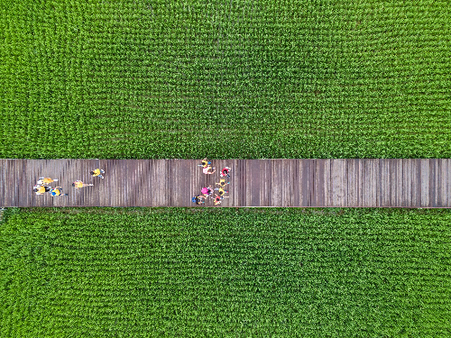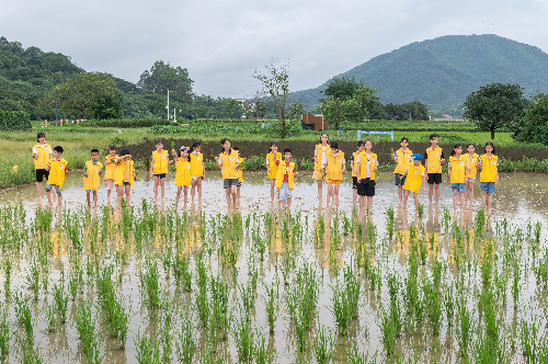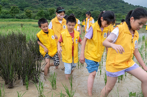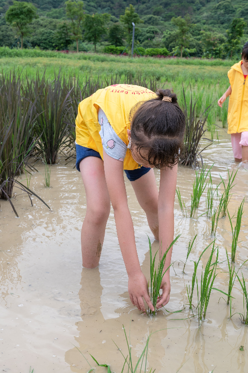 走出室内的文化馆,穿过“希望之翼”,步入“时光之门”,万顷的稻浪涌起绿波,笔直的木栈道通向远方。小记者们跟随着讲解员的脚步,深入稻田中,亲身体验插秧等农业活动。他们鼓足勇气,脱下鞋袜、挽起裤腿,一个接着一个踏入稻田中央,在工作人员的指导下,将秧苗整整齐齐地插入了水田之中。穿行于田间的孩子,就像他们刚刚插下的秧苗一般,生机郁郁。小记者骆晓萱认为,这是一次难得的户外活动:“平时,爸爸妈妈只是周末带我去爬山,这是我第一次体验插秧。”看着孩子被汗水打湿的脸庞,小记者伍荣轩的母亲也表示:“平时在城市里,没有机会带孩子来体验农活,我觉得这样的活动很有意义。”