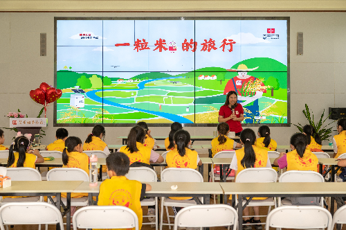 下午,艾米小镇的工作人员为小记者们准备了一节别开生面的研学课堂。在“米博士”的带领下,小记者们体验了“一粒米的旅行”,掌握了粮食生产、耕地保护的相关知识,并强化了节约粮食的意识。在课堂中,小记者们积极举手抢答,气氛活跃。