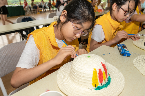 在随后开展的全国土地日草帽绘画活动中,小记者们绘出心目中的田园风光,在草帽帽檐上画下一串串饱满金黄的稻穗,并为图画取名为“丰年乐”;不少小记者还结合课堂中学到的知识,把水稻生长的不同阶段画在了草帽上。绘制完毕后,小记者们纷纷戴上自己的草帽,模仿“小农夫”进行合影留念。