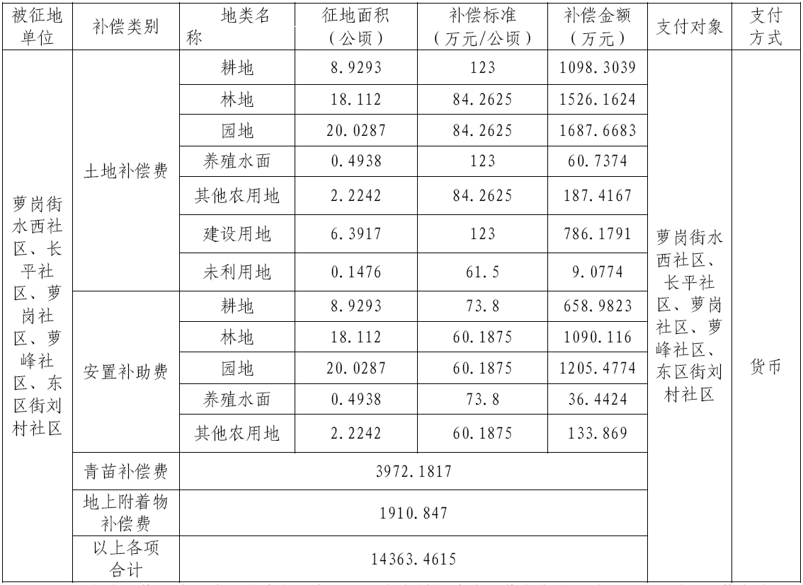 三、被征地村及面积:广州市黄埔区萝岗街水西社区、长平社区、萝岗社区、萝峰社区、东区街刘村社区属下的集体农用地39.0155公顷(耕地4.3349公顷、园地17.9033公顷(含可调整园地10.0314公顷)、林地14.2771公顷(含可调整林地0.4493公顷)、养殖水面0.4938公顷(含可调整养殖水面0.0315公顷)、其他农用地(不含养殖水面)2.0064公顷)以及上述有关村集体建设用地17.1642公顷、未利用地0.1476公顷,合计56.3273公顷。