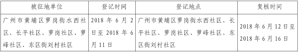 (二)本次征收土地所涉及的被安置农业人员由广州市黄埔区萝岗街水西社区、长平社区、萝岗社区、萝峰社区、东区街刘村社区在本公告期内到广州开发区 广州市黄埔区国土资源和规划局领取办理安置农业人口征地农转非手续的函件。