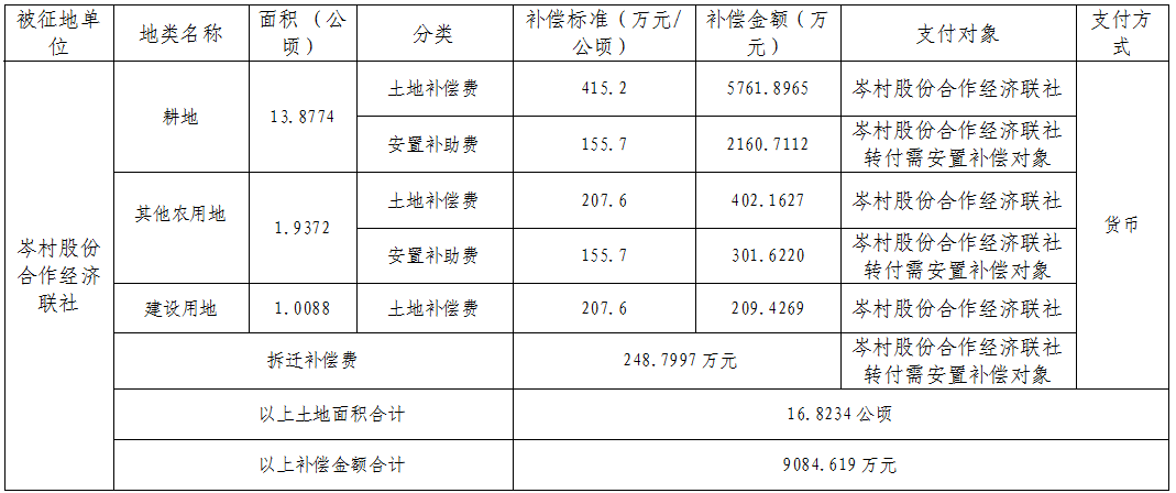 三、被征地村及面积:  岑村股份合作经济联社集体土地面积16.8234公顷(其中耕地13.8774公顷、其他农用地1.9372公顷、建设用地1.0088公顷)