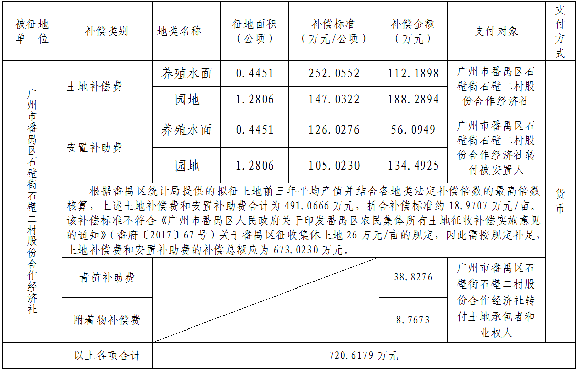 三、被征地村及面积:广州市番禺区石壁街石壁二村股份合作经济社,集体土地1.7257公顷(折合约25.8855亩),其中园地1.2806公顷(折合约19.2090亩),养殖水面0.4451公顷(合6.6765亩)。