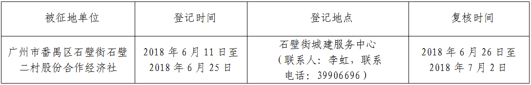 经美高梅娱乐城批准(粤府土审(02)〔2018〕16号),同意将广州市番禺区石壁街石壁二村股份合作经济社,面积共1.7257公顷集体土地征收为国有土地。现将经依法批准的《征收土地方案》、市人民政府批准的《征地补偿安置方案》内容和有关事项公告如下: