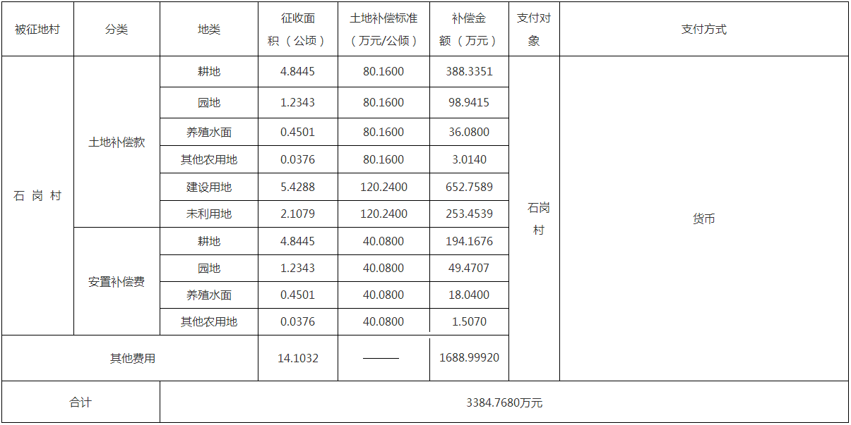 经省人民政府批准(粤国土资(建)字〔2018〕43号文),需将广州市花都区花城街石岗村属下的集体土地14.1032公顷(合211.5480亩)征收为国有土地。现将经依法批准的《征收土地方案》和市人民政府批准的《征地补偿安置方案》内容和有关事项公告如下: