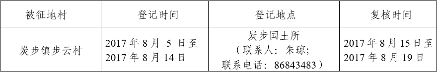 五、被征收土地四至范围内的土地所有权人、使用权人在本公告规定的期限内,持土地权属证书或其他有关证明材料,到指定的地点办理征地补偿登记,请互相转告。