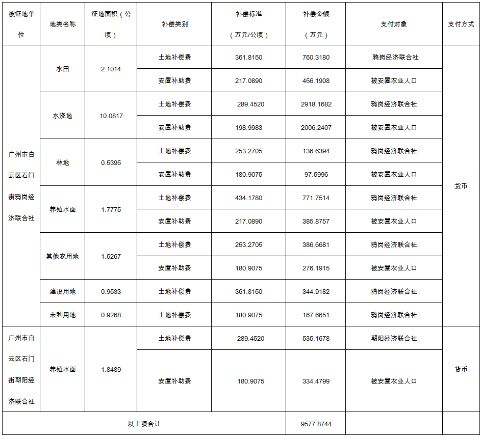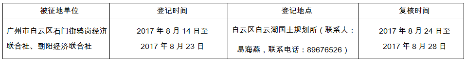 (二)本次征收土地所涉及的被安置农业人员由广州市白云区石门街鸦岗经济联合社、朝阳经济联合社以货币补偿的形式安置。请被征地村在本公告期内到广州市白云区国土资源和规划局领取办理安置农业人口征地农转非手续的函件。