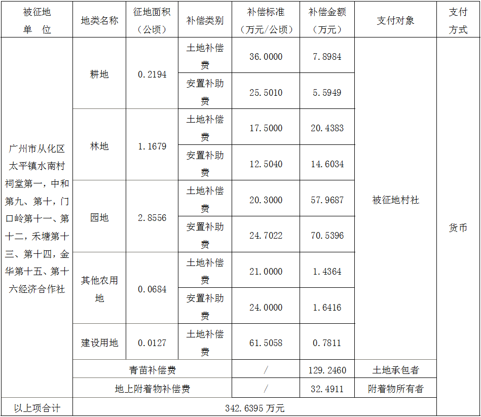 (二)本次征收土地所涉及的被安置农业人员由广州市从化区太平镇水南村祠堂第一,中和第九、第十,门口岭第十一、第十二,禾塘第十三、第十四,金华第十五、第十六经济合作社以货币补偿等形式安置。