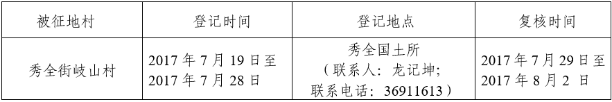 五、被征收土地四至范围内的土地所有权人、使用权人在本公告规定的期限内,持土地权属证书或其他有关证明材料,到指定的地点办理征地补偿登记,请互相转告。