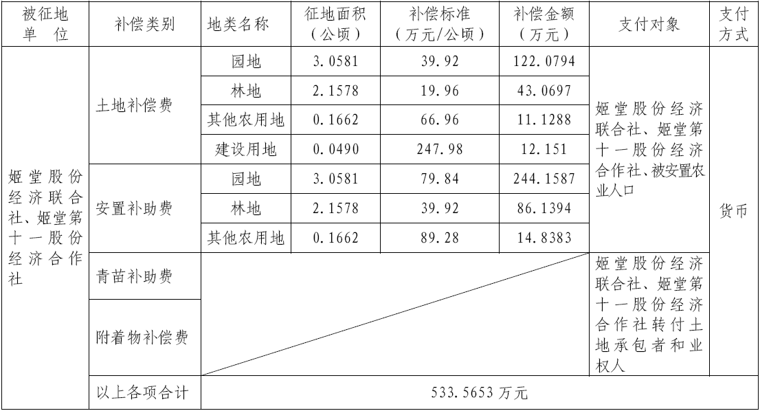 (三)本次征收土地作为姬堂股份经济联合社的经济发展留用地,且土地权属为大沙街姬堂股份经济联合社、姬堂第十一股份经济合作社属下的集体土地,本次征收土地未发生实际的征地补偿费用;本次征收土地范围内所涉及的征地补偿费、安置补助费、建(构)筑物及青苗补偿费等由姬堂股份经济联合自行协商并处理完毕。
