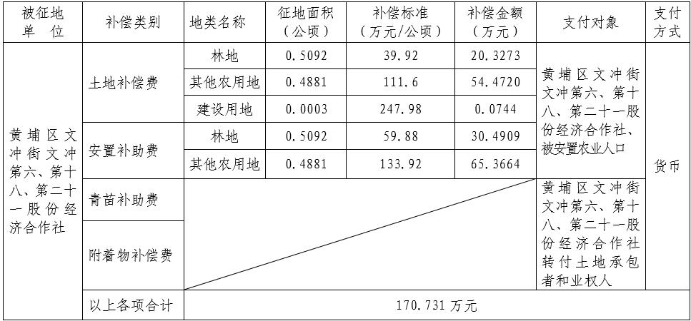 (三)本次征收土地作为文冲股份经济联合社的经济发展留用地,且土地权属为文冲街文冲第六、  第十八、第二十一股份经济合作社属下的集体土地,本次征收土地未发生实际的征地补偿费用;本次征  收土地范围内所涉及的安置补助费、建(构)筑物及青苗补偿费等补偿由文冲股份经济联合社及经济合  作社自行协商并处理完毕。