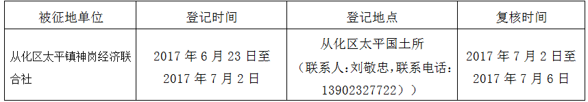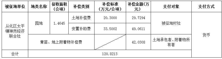 (二)本次征收土地所涉及的被安置农业人员由广州市从化区太平镇神岗经济联合社以货币补偿等形式安置。