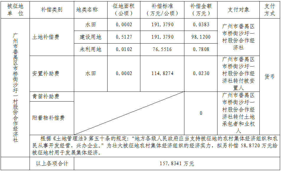 三、被征地村及面积:广州市番禺区市桥街沙圩一村股份合作经济社,集体土地0.5231公顷(折合约7.8465亩),其中耕地0.0002公顷(折合约0.0030亩),建设用地0.5127公顷(合7.6905亩),未利用地0.0102公顷(折合约0.1530亩)。