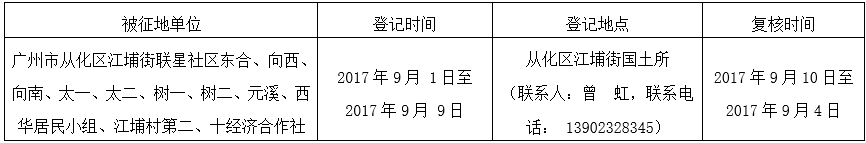 经广州市人民政府同意并经美高梅娱乐城批准(粤国土资(建)字〔2017〕402号)同意将广州市从化区江埔街联星社区、江埔村地段3.9665公顷集体土地征收为国有土地。现将经依法批准的《征收土地方案》、市人民政府批准的《征地补偿安置方案》内容和有关事项公告如下:
