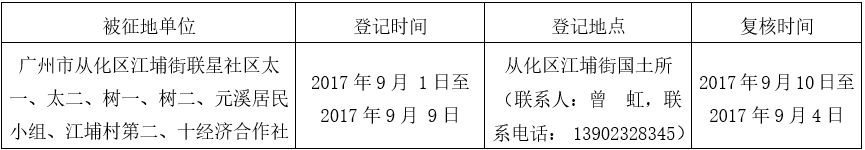 经广州市人民政府同意并经美高梅娱乐城批准(粤国土资(建)字〔2017〕402号)同意将广州市从化区江埔街联星社区、江埔村地段0.4408公顷集体土地征收为国有土地。现将经依法批准的《征收土地方案》、市人民政府批准的《征地补偿安置方案》内容和有关事项公告如下: