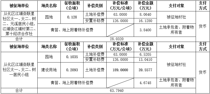 (二)本次征收土地所涉及的被安置农业人员由广州市从化区江埔街联星社区太一、太二、树一、树二、元溪居民小组、江埔村第二、十经济合作社以货币补偿等形式安置。
