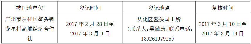 经广州市人民政府同意并经美高梅娱乐城批准(粤国土资(建)字〔2017〕16号)同意将广州市从化区鳌头镇龙星村地段0.4949公顷集体土地征收为国有土地。现将经依法批准的《征收土地方案》、市人民政府批准的《征地补偿安置方案》内容和有关事项公告如下: