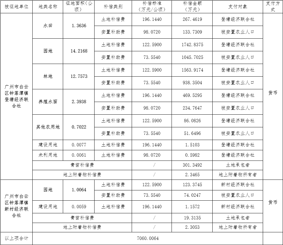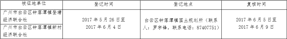 (二)本次征收土地所涉及的被安置农业人员由广州市白云区钟落潭镇登塘农民集体经济联合社、新村农民集体经济联合社以货币补偿的形式安置。请被征地村在本公告期内到广州市白云区国土资源和规划局领取办理安置农业人口征地农转非手续的函件。