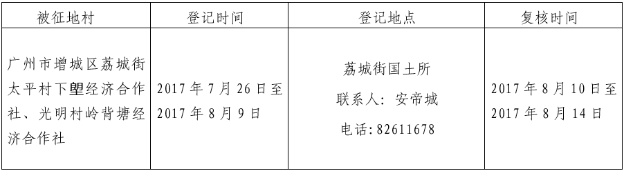 二、征收土地位置:广州市增城区荔城街太平村下塱经济联合社和光明村岭背塘经济合作社(范围详见附图)。