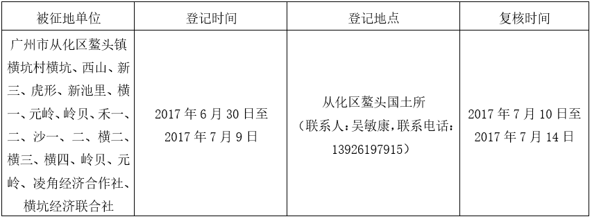 经广州市人民政府同意并经美高梅娱乐城批准(粤国土资(建)字〔2016〕636号)同意将广州市从化区鳌头镇横坑村地段53.7226公顷集体土地征收为国有土地。现将经依法批准的《征收土地方案》、市人民政府批准的《征地补偿安置方案》内容和有关事项公告如下: