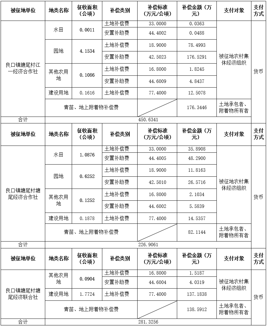 (二)本次征收土地所涉及的被安置农业人员由广州市从化区良口镇塘尾村江一经济合作社、塘尾经济合作社、塘尾经济联合社以货币补偿等形式安置。