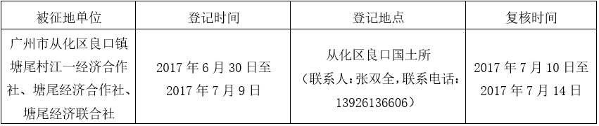 经广州市人民政府同意并经美高梅娱乐城批准(粤国土资(建)字〔2017〕17号)同意将广州市从化区良口镇塘尾村地段8.3133公顷集体土地征收为国有土地。现将经依法批准的《征收土地方案》、市人民政府批准的《征地补偿安置方案》内容和有关事项公告如下: