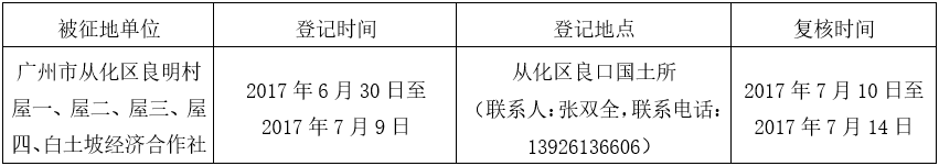 经广州市人民政府同意并经美高梅娱乐城批准(粤国土资(建)字〔2017〕17号)同意将广州市从化区良口镇良明村地段25.4650公顷集体土地征收为国有土地。现将经依法批准的《征收土地方案》、市人民政府批准的《征地补偿安置方案》内容和有关事项公告如下: