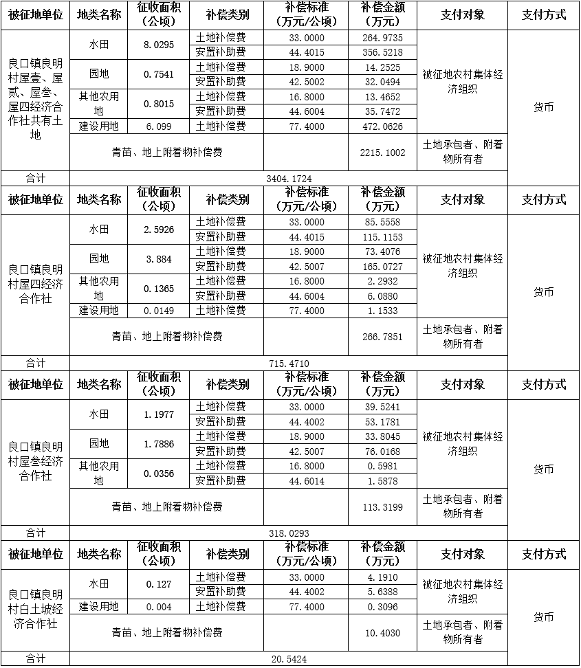 (二)本次征收土地所涉及的被安置农业人员由广州市从化区良口镇良明村屋一、屋二、屋三、屋四、白土坡经济合作社以货币补偿等形式安置。