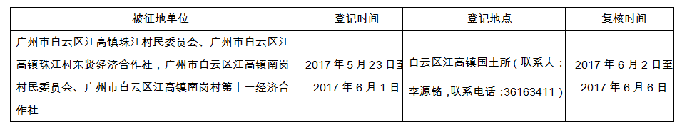 (二)本次征收土地所涉及的被安置农业人员由广州市白云区江高镇珠江村民委员会、广州市白云区江高镇珠江村东贤经济合作社,广州市白云区江高镇南岗村民委员会、广州市白云区江高镇南岗村第十一经济合作社以货币补偿的形式安置。请被征地村在本公告期内到广州市白云区国土资源和规划局领取办理安置农业人口征地农转非手续的函件。