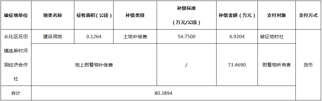 (二)本次征收土地所涉及的被安置农业人员由广州市从化区吕田镇连麻村河洞经济合作社以货币补偿等形式安置。