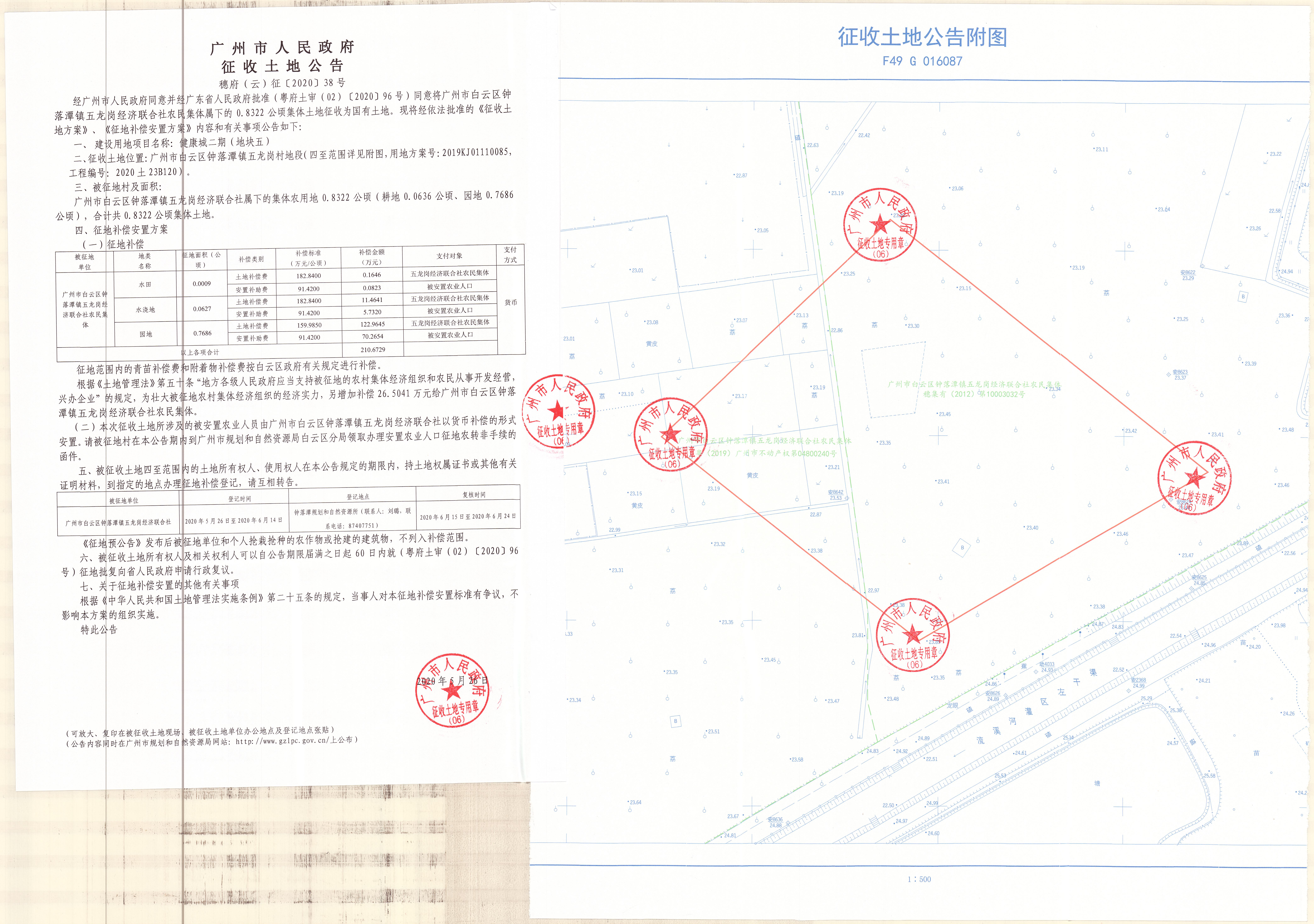 经广州市人民政府同意并经美高梅娱乐城批准(粤府土审(02)〔2020〕96号)同意将广州市白云区钟落潭镇五龙岗经济联合社农民集体属下的0.8322公顷集体土地征收为国有土地。现将经依法批准的《征收土地方案》、《征地补偿安置方案》内容和有关事项公告如下: