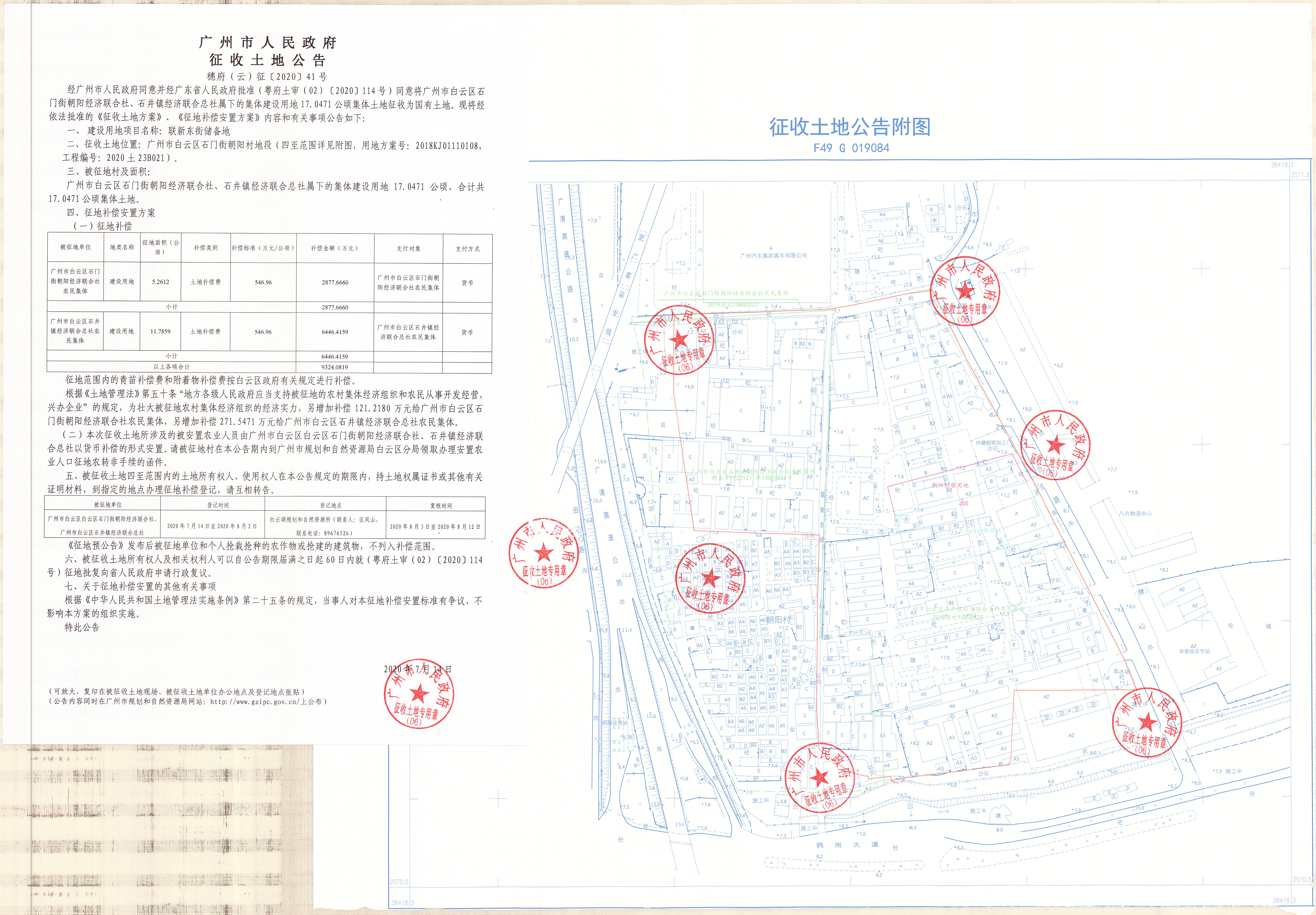 经广州市人民政府同意并经美高梅娱乐城批准(粤府土审(02)〔2020〕114号)同意将广州市白云区石门街朝阳经济联合社、石井镇经济联合总社属下的集体建设用地17.0471公顷集体土地征收为国有土地。现将经依法批准的《征收土地方案》、《征地补偿安置方案》内容和有关事项公告如下: