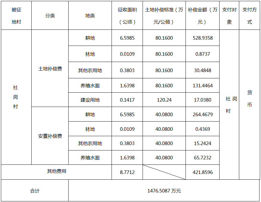 花都区炭步镇社岗村集体土地合计8.7712公顷(合131.568亩),其中耕地6.5985公顷(合98.9775亩)、林地0.0109公顷(合0.1635亩)、其他农用地0.3803公顷(合5.7045亩)、养殖水面1.6398公顷(合24.597亩)、建设用地0.1417公顷(合2.1255亩);