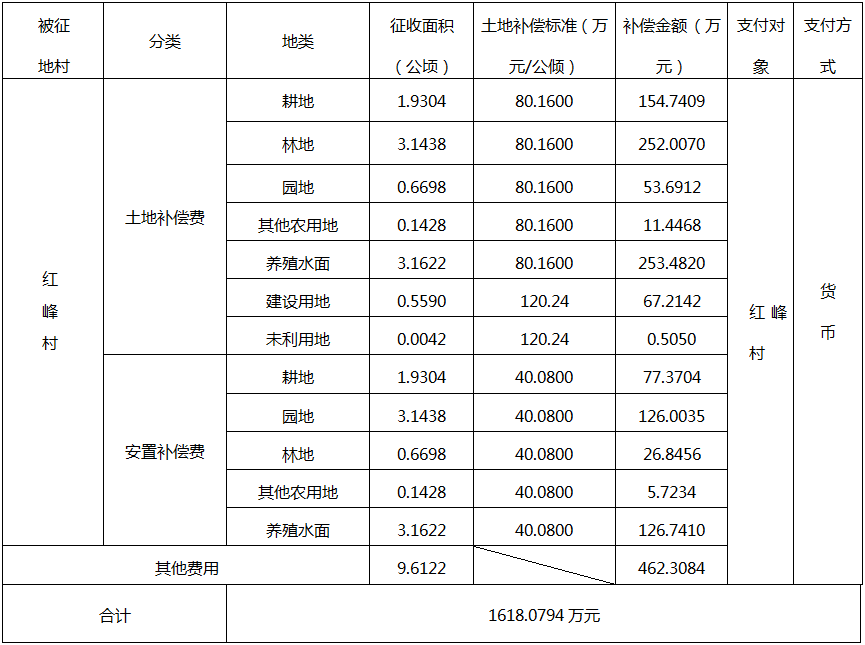花都区炭步镇红峰村集体土地合计9.6122公顷(合144.183亩),其中耕地1.9304公顷(合28.956亩)、林地3.1438公顷(合47.157亩)、园地0.6698公顷(合10.047亩)、养殖水面3.1622公顷(合293.217亩)、其他农用地0.1428公顷(合2.142亩)、建设用地0.5590公顷(合8.385亩)、未利用地0.0042公顷(合0.063亩);