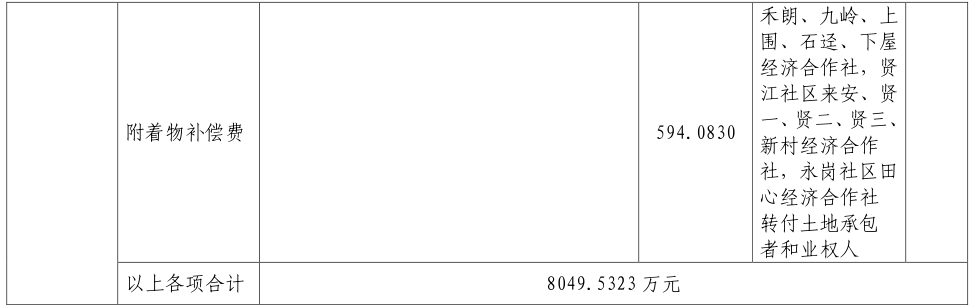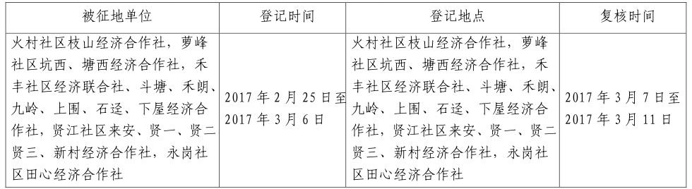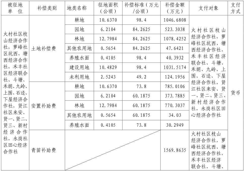 三、被征地村及面积:广州市黄埔区(原萝岗区)火村社区枝山经济合作社,萝峰社区坑西、塘西经济合作社,禾丰社区经济联合社、斗塘、禾朗、九岭、上围、石迳、下屋经济合作社,贤江社区来安、贤一、贤二、贤