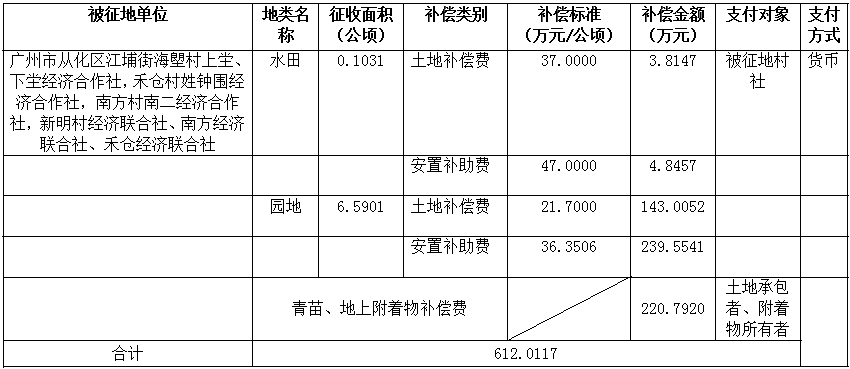 (二)本次征收土地所涉及的被安置农业人员由广州市从化区江埔街海塱村上坣、下坣经济合作社,禾仓村姓钟围经济合作社,南方村南二经济合作社,新明村经济联合社、南方经济联合社、禾仓经济联合社以货币补偿等形式安置。