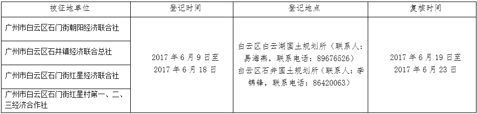 (二)本次征收土地所涉及的被安置农业人员由广州市白云区石门街朝阳经济联合社、广州市白云区石井镇经济联合总社、广州市白云区石门街红星经济联合社、广州市白云区石门街红星村第一、二、三经济合作社以货币补偿的形式安置。请被征地村在本公告期内到广州市白云区国土资源和规划局领取办理安置农业人口征地农转非手续的函件。