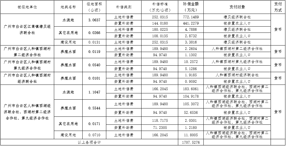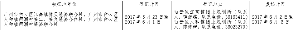 (二)本次征收土地所涉及的被安置农业人员由广州市白云区江高镇塘贝经济联合社、广州市白云区人和镇西湖村第二经济合作社、广州市白云区人和镇西湖村第九经济合作社、广州市白云区人和镇西湖经济联合社以货币补偿的形式安置。请被征地村在本公告期内到广州市白云区国土资源和规划局领取办理安置农业人口征地农转非手续的函件。
