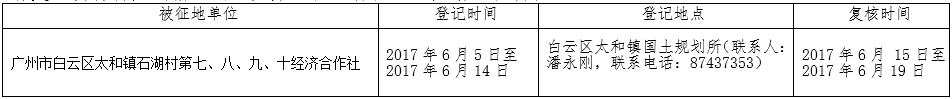 经广州市人民政府同意并经美高梅娱乐城批准(粤国土资(建)字〔2017〕239号)同意将白云区太和镇石湖村地段5.5541公顷集体土地征收为国有土地。现将经依法批准的《征收土地方案》、市人民政府批准的《征地补偿安置方案》内容和有关事项公告如下: