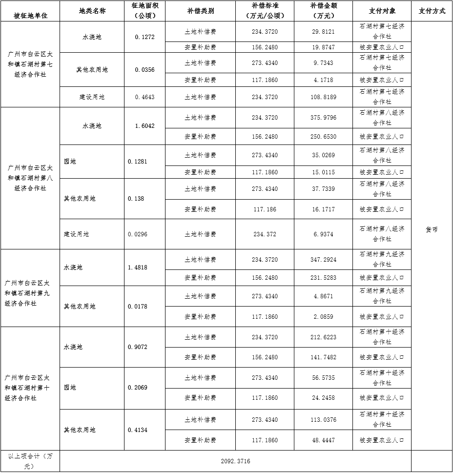 三、被征地村及面积:广州市白云区太和镇石湖村第七、八、九、十经济合作社属下集体农用地5.0602公顷(耕地4.1204公顷、园地0.3350公顷〔均为可调地类〕、其他农用地0.6048公顷,建设用地0.4939公顷。