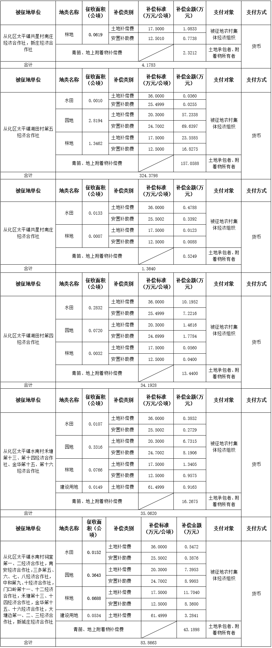(二)本次征收土地所涉及的被安置农业人员由广州市从化区太平镇共星村南庄、新庄经济合作社,湖田村第四、第五经济合作社,水南村禾塘第十三、十四合作社,祠堂第一、第二经济合作社,南安经济合作社,三多第五、第六、第七、第八经济合作社,水南村中和第九、第十经济合作社,门口岭第十一、第十二经济合作社,禾塘第十三、第十四经济合作社,金华第十五、第十六经济合作社,大塘边第一、第二、第三经济合作社,水南村新城庄经济合作社以货币补偿等形式安置。