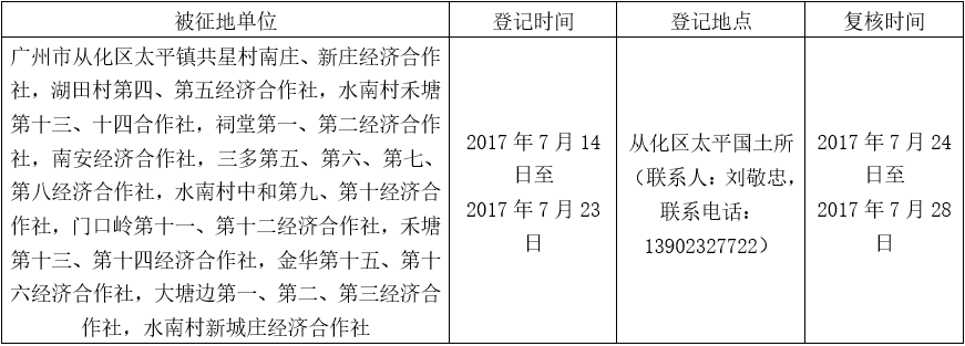 经广州市人民政府同意并经美高梅娱乐城批准(粤国土资(建)字〔2016〕684号)同意将广州市从化区太平镇共星村、湖田村、水南村地段6.1364公顷集体土地征收为国有土地。现将经依法批准的《征收土地方案》、市人民政府批准的《征地补偿安置方案》内容和有关事项公告如下: