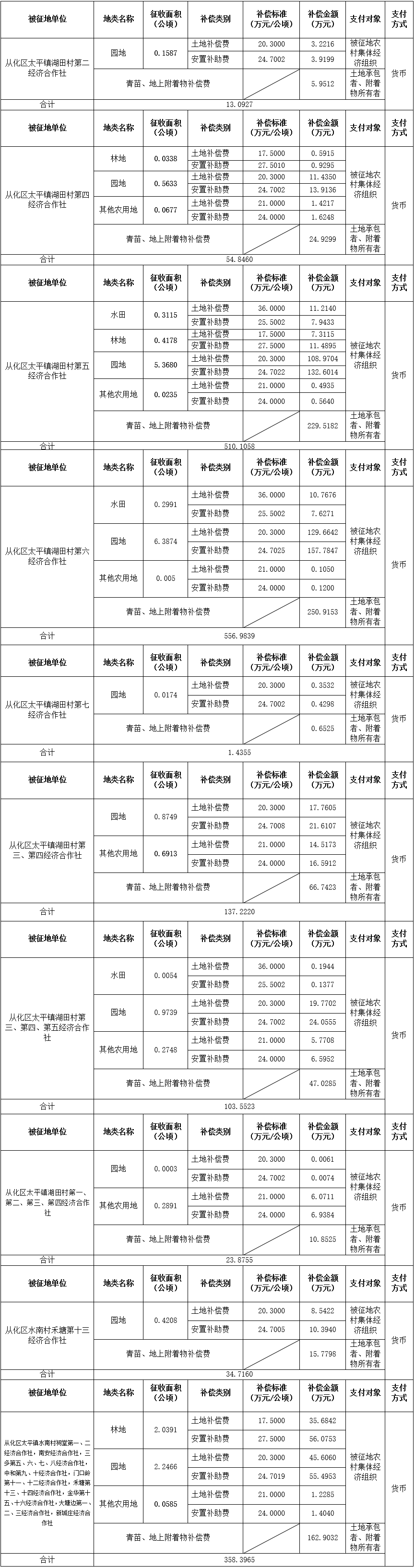 (二)本次征收土地所涉及的被安置农业人员由广州市从化区太平镇湖田村第一、第二、第三、第四、第五、第六、第七经济合作社,水南村祠堂第一、二经济合作社,水南村南安经济合作社,水南村三多第五、六、七、八经济合作社,水南村中和第九、第十经济合作社,水南村门口岭第十一、十二经济合作社,水南村禾塘第十三、十四经济合作社,水南村金华第十五、十六经济合作社,水南村大塘边第一、二、三经济合作社,新城庄经济合作社以货币补偿等形式安置。