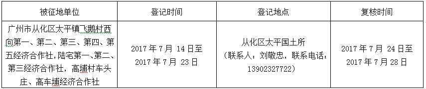广州市从化区太平镇飞鹅村西向第一、第二、第三、第四、第五经济合作社,陆宅第一、第二、第三经济合作社,高埔村车头庄、高车埔经济合作社集体土地23.3398公顷。
