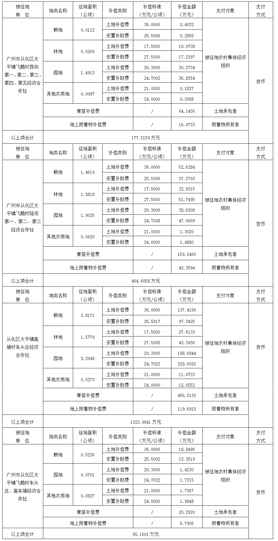 (二)本次征收土地所涉及的被安置农业人员由广州市从化区太平镇飞鹅村西向第一、第二、第三、第四、第五经济合作社,陆宅第一、第二、第三经济合作社,高埔村车头庄、高车埔经济合作社以货币补偿等形式安置。