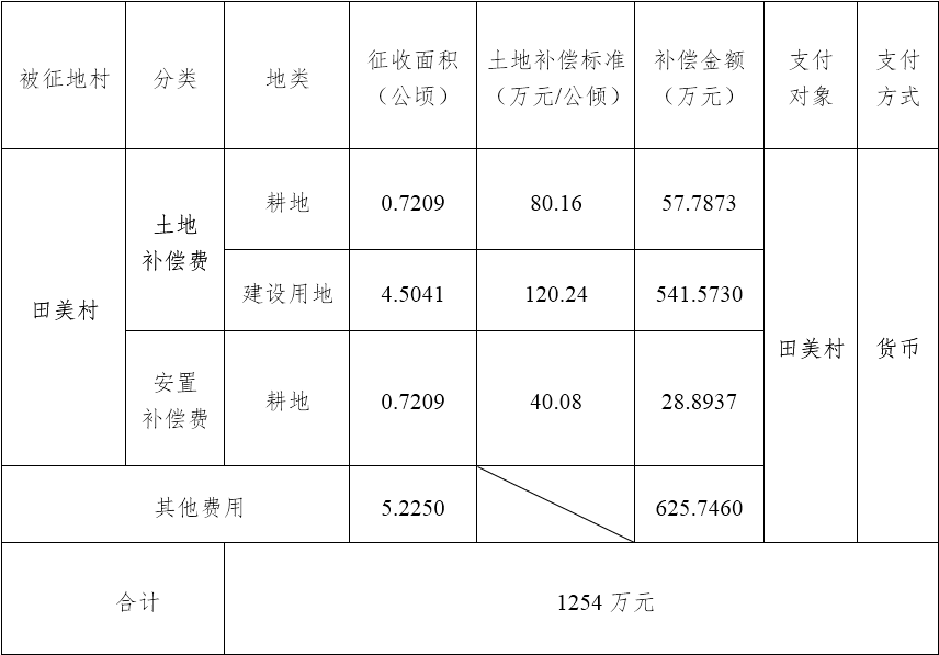三、被征地村及面积:广州市花都区新华街田美村集体土地5.2250公顷(合78.375亩),其中耕地0.7209公顷(合10.8135亩),建设用地4.5041公顷(合67.5615亩)。